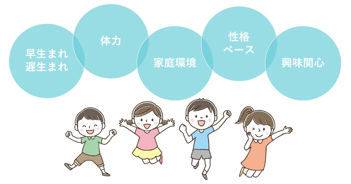 子どもは一人一人、ペースや興味関心、体力も違います。早生まれ、遅生まれの差に加え、家庭環境の違いで知識や経験値にもバラつきがあり、皆同じようには出来ないのが自然です。