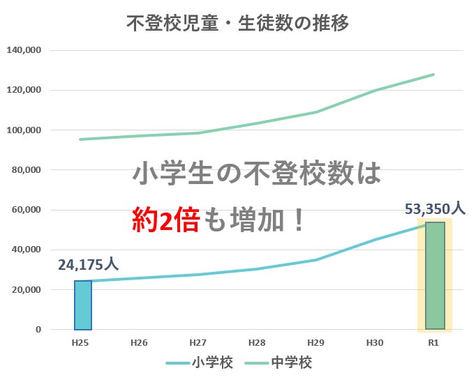 令和元年度の調査では、不登校児童生徒数は231,372人。特に小学校では、6年前の平成25年と比べると、24,175人→53,350人と、その数2倍以上に増えています。