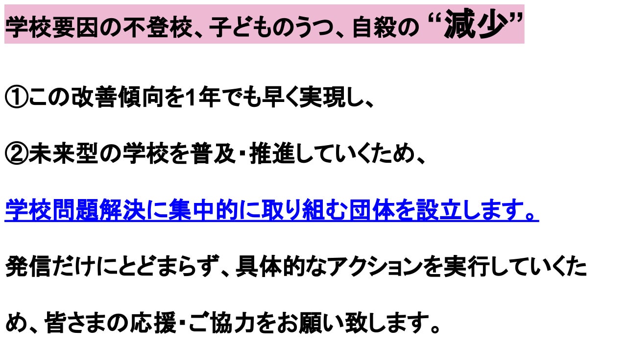 自殺に追い込まれる児童生徒を救うための緊急対策や、悩みが相談できる環境、居場所づくりはもちろん重要ですが、こうした緊急対策や対症療法的な対策だけでは根本的な解決には至りません。「不登校や自殺の要因となっている根本原因」を解消する対策も、早急に講じるべきです。