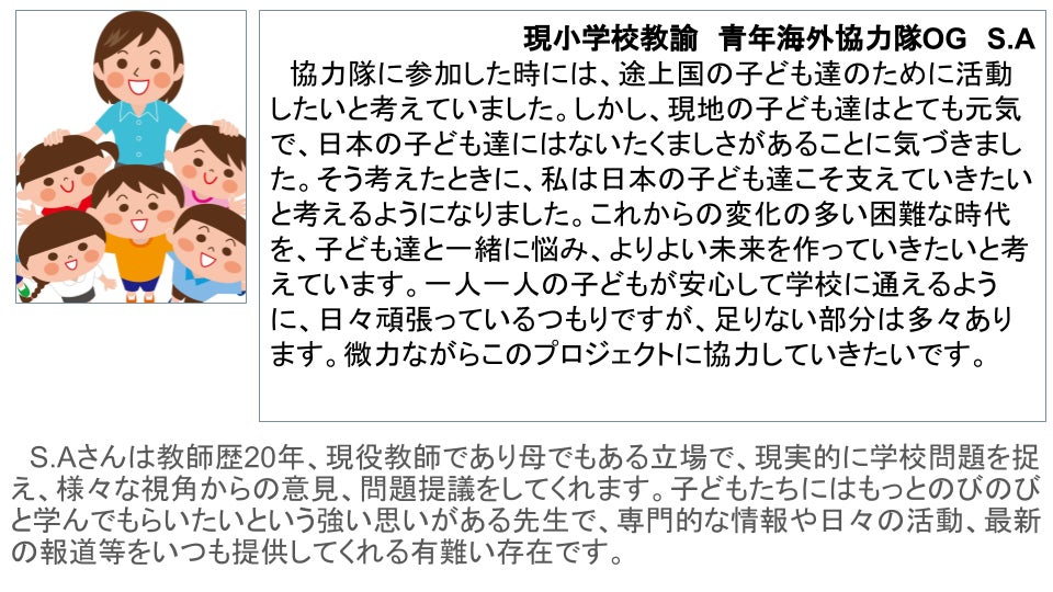 「子ども」は親にとって代替のきかない宝物であり、社会にとっても存在そのものが未来への架け橋です。学校要因の不安やストレスに精神的に押し潰されたり、教育格差の犠牲になることなく、子どもたち一人ひとりがもつ興味関心や得意なことを最大限に伸ばし、潜在能力を存分に発揮できるように日本社会がもっと投資すれば、日本は新しい形で発展し、世界にも良い影響を与え、未来はもっと明るくなると信じています。