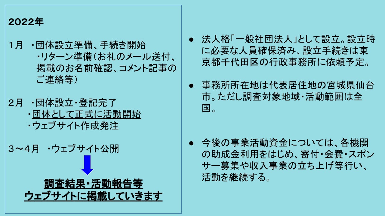 ご支援いただいた方には、お礼のメール、お名前掲載、活動報告メール、設立報告会へのご招待、ウェブサイトへのコメント記事掲載等を考えております。詳細はリターン欄をご覧ください。(お名前およびコメント記事の掲載など、リターンをご希望されない場合はご辞退も可能です。備考欄へのご記入にてお知らせください。)