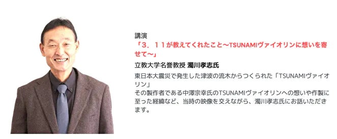 その中で、「千の音色で繋ぐ絆プロジェクト」の一環としてTSUNAMIヴァイオリンの演奏も取り入れます。