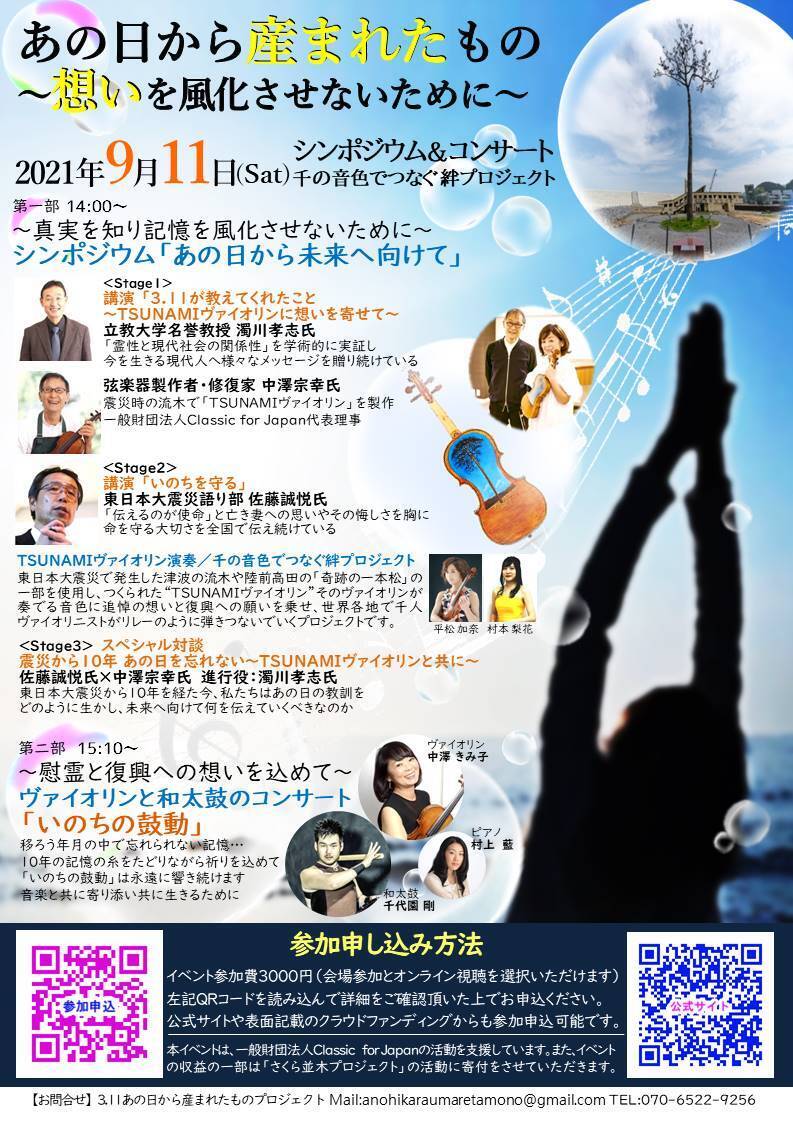 2021/09/15 11:359/11無事に本イベントは終了しました。まだアーカイブ視聴はできますので引き続きご覧いただけると幸いです。当日の様子を一部掲載します。濁川孝志講演佐藤誠悦講演TSUNAMIヴァイオリン佐藤誠悦、中澤宗幸、濁川孝志対談中澤きみ子TSUNAMIヴァイオリン千代園剛和太鼓TSUNAMIヴァイオリン×和太鼓×ピアノ出演者最後に実行委員長濁川孝志からの御礼を載せます。この度は私たちの企画イベント『3・11あの日から産まれたもの~想いを風化させないために』の実施に当たり、多大なるご支援を頂きました。ここに、心より厚く御礼申し上げます。皆様のご支援のお陰もあり、イベントは大成功の下無事実施することができました。昨年夏にこの企画がスタートして以来、このイベントはコロナ禍という大逆風に見舞われ、会場の変更、日程の変更等を余儀なくされ紆余曲折の末なんとか実施できたというのが実態でした。そんな中、予定した登壇者が誰一人欠けることもなく、全てのスタッフがこの会を支えてくれました。実行委員長として、本当に有り難く感謝に堪えません。これもひとえに、「あの3・11の出来事を、そう簡単に風化させたなるものか」という皆様の強い想いの表れかと感じております。人間には忘れ去らないと次の一歩が踏み出せないこともありますが、その一方で決して忘れてはならないこともあります。3・11の大きな教訓の一つは、我々日本人に「利他の心を思い出せ」ということでした。私たちはこの教訓を忘れることなく、同時に今でも進行形で存在する様々な問題に想いを馳せ、これからの日々を過ごして行きたいと思います。この出来事の語り部となり、末永く未来へ語り継ぎたいと思います。 繰り返しになりますが、再度、皆様のご支援に対する厚い感謝の意をここに表し、御礼のご挨拶に代えさせて頂きたいと思います。本当に、ありがとうございました。2021年9月12日 実行委員長 濁川孝志ご支援ありがとうございました。実行委員一同。 もっと見る