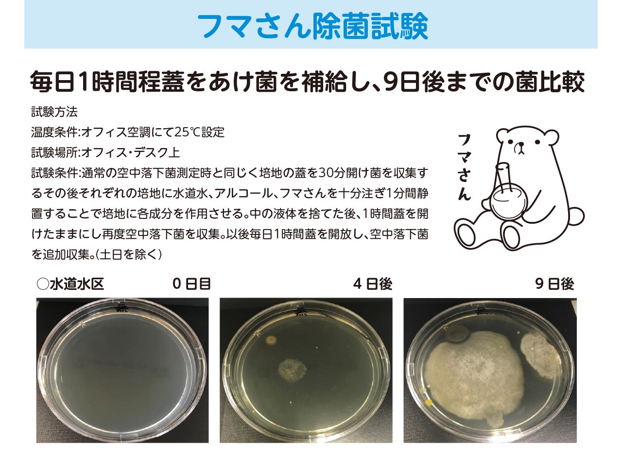 寒天培地にフマさんと他比較を十分噴霧し、各液を十分乾燥させた後フタをした。対象区ではフタをするまでに培地へ落下したカビや黄色ブドウ球菌が増殖したものの、フマさん処理区は菌類が繁殖しなかったので持続性除菌能力を有することが示された。