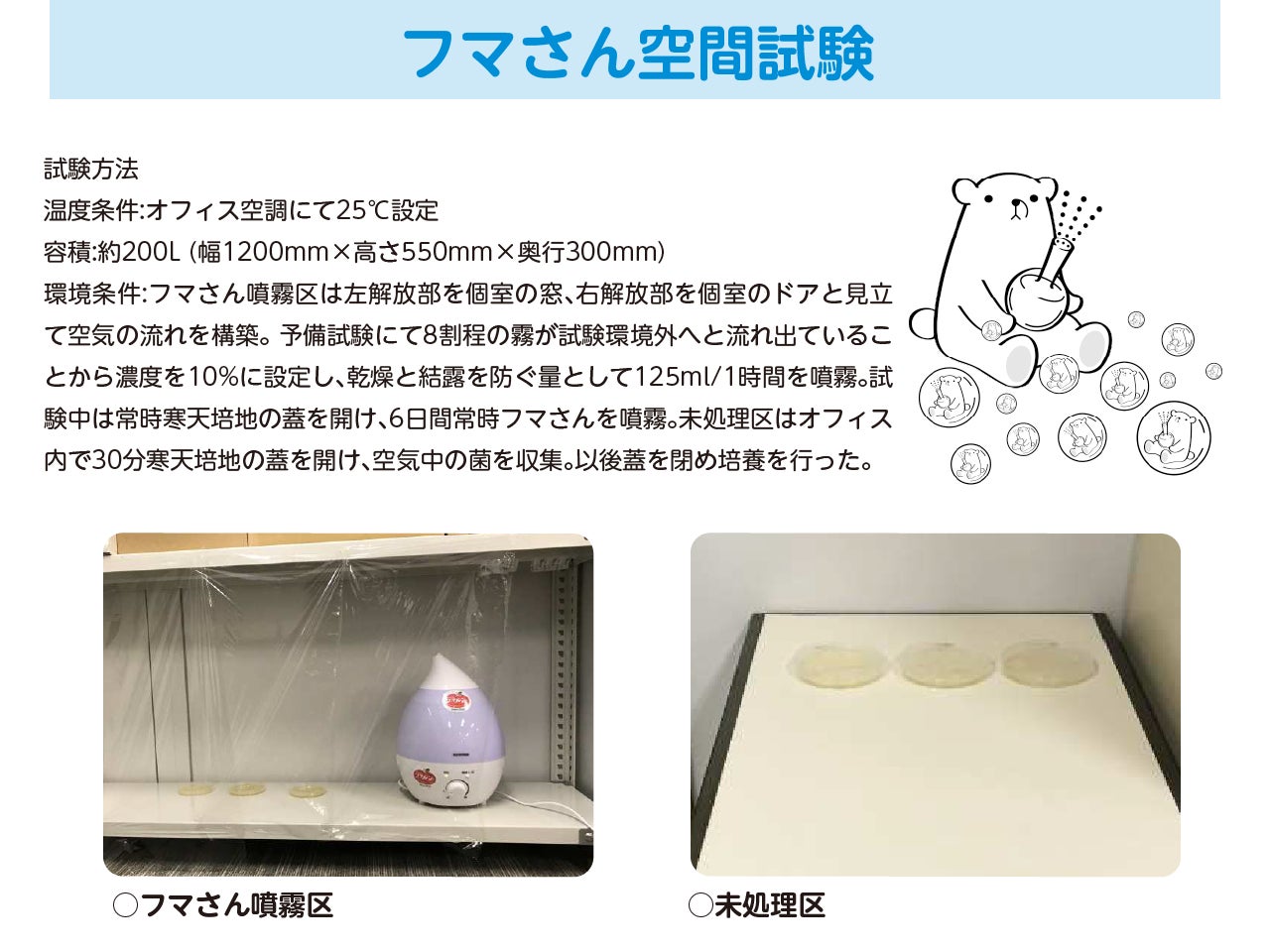 フタをあけた寒天培地に対し、加湿器にてフマさんならびに水を試験期間中連続噴霧。無処理区は30分蓋を開放し、蓋を閉めた後6日間静置。フマさんを噴霧した場合は培地へ落下したカビや黄色ブドウ球菌を除菌・抑制することが示された。