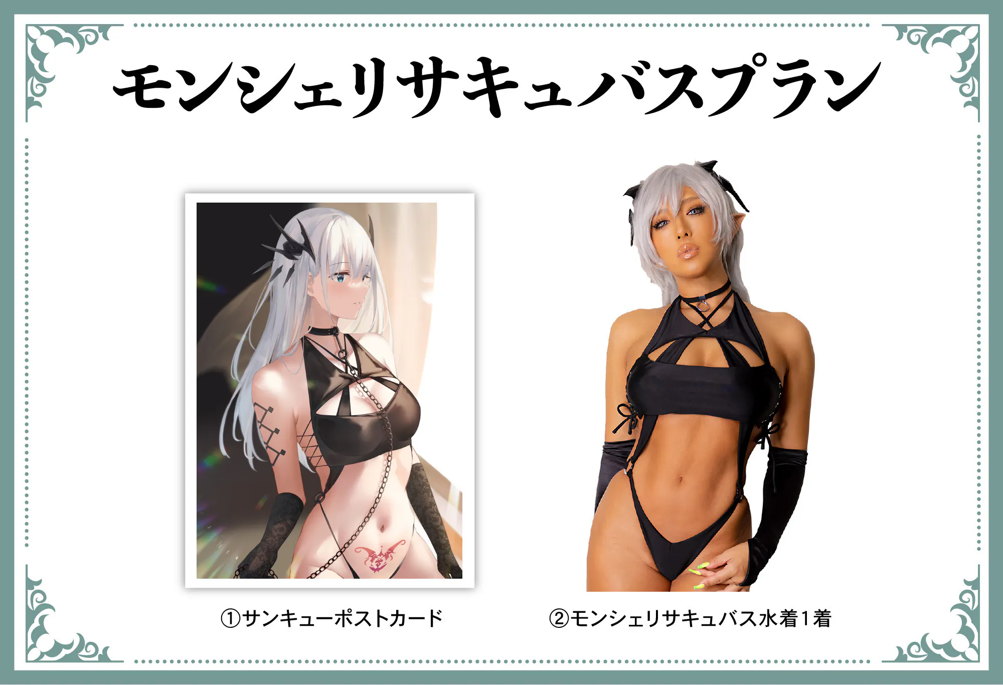 モンシェリサキュバス水着とサンキューポストカードがセットになったプラン!鈴雨やつみさん拘りの衣装を是非ゲットして下さい!