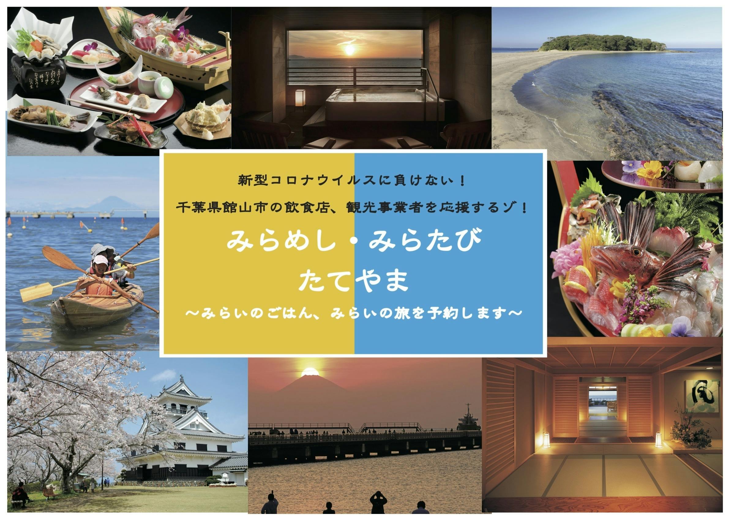 「未来のごはん」を予約して、館山の多彩な飲食店で、みなさんが元気な姿でお食事する様子、・・・、「未来の旅」を予約して館山の楽しい観光施設で、温泉や旅の風情を楽しむ様子・・・、感染症対策を施してみなさまのご来店をお待ちしています。