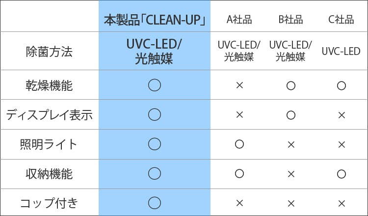 「CLEAN-UP」があれば歯ブラシをいれておくだけで除菌ができるので気持ちよくお使いいただけます。