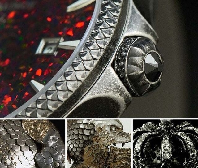 中世の騎士、アーサー王の鎧に影響されたドラゴン仕様のケース、剣の形をした針、この時計を構成する全てのパーツは自社で製造しています。