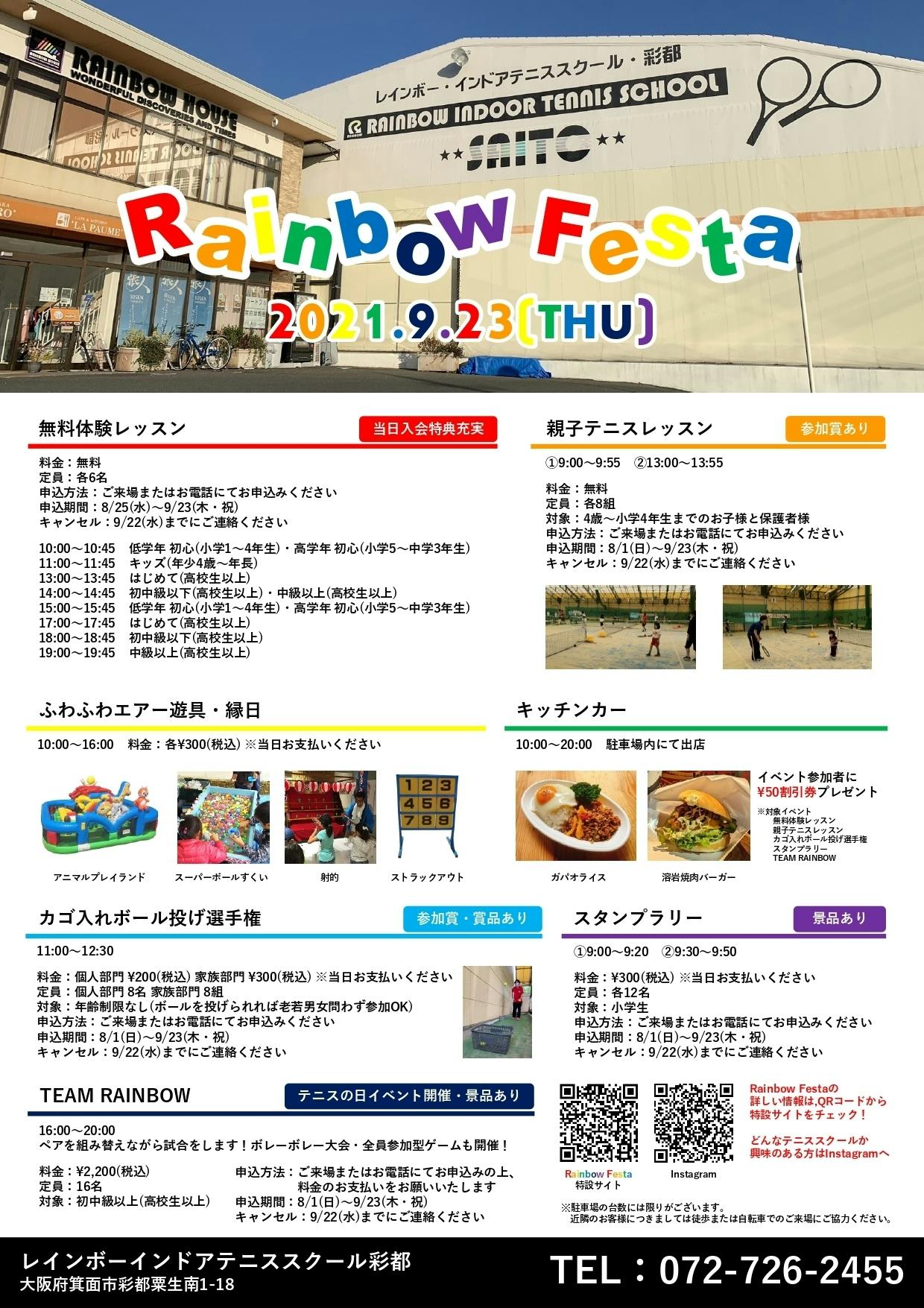 2021年9月23日(木)に当スクールで行うテニスイベントと同時に、テニスコートで「子供たちが思いっきり遊べる空間」をつくり、駐車場で「縁日」や「キッチンカー」を出店するイベントです。