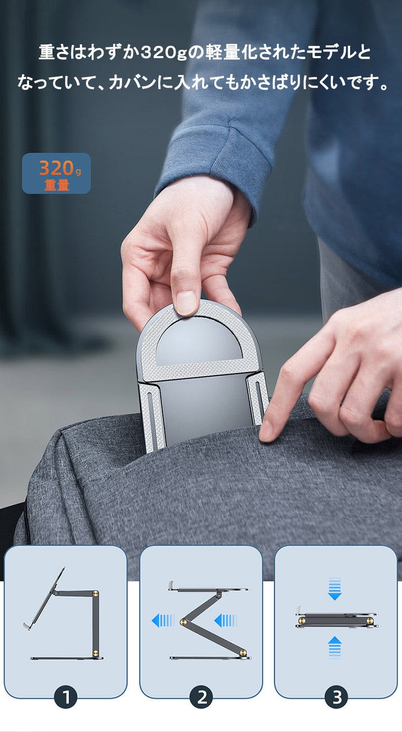 折りたたみ式のスタンドとして、ただ320gで収納や持ち運びにも便利、外出先でも使えるとさらに活用シーンが広がります。折りたためるタイプでポケットやカバンに入るので、カフェでお茶をしながらスマホを楽しんだり、オフィスでサブ画面として使ったりすることもできます。
