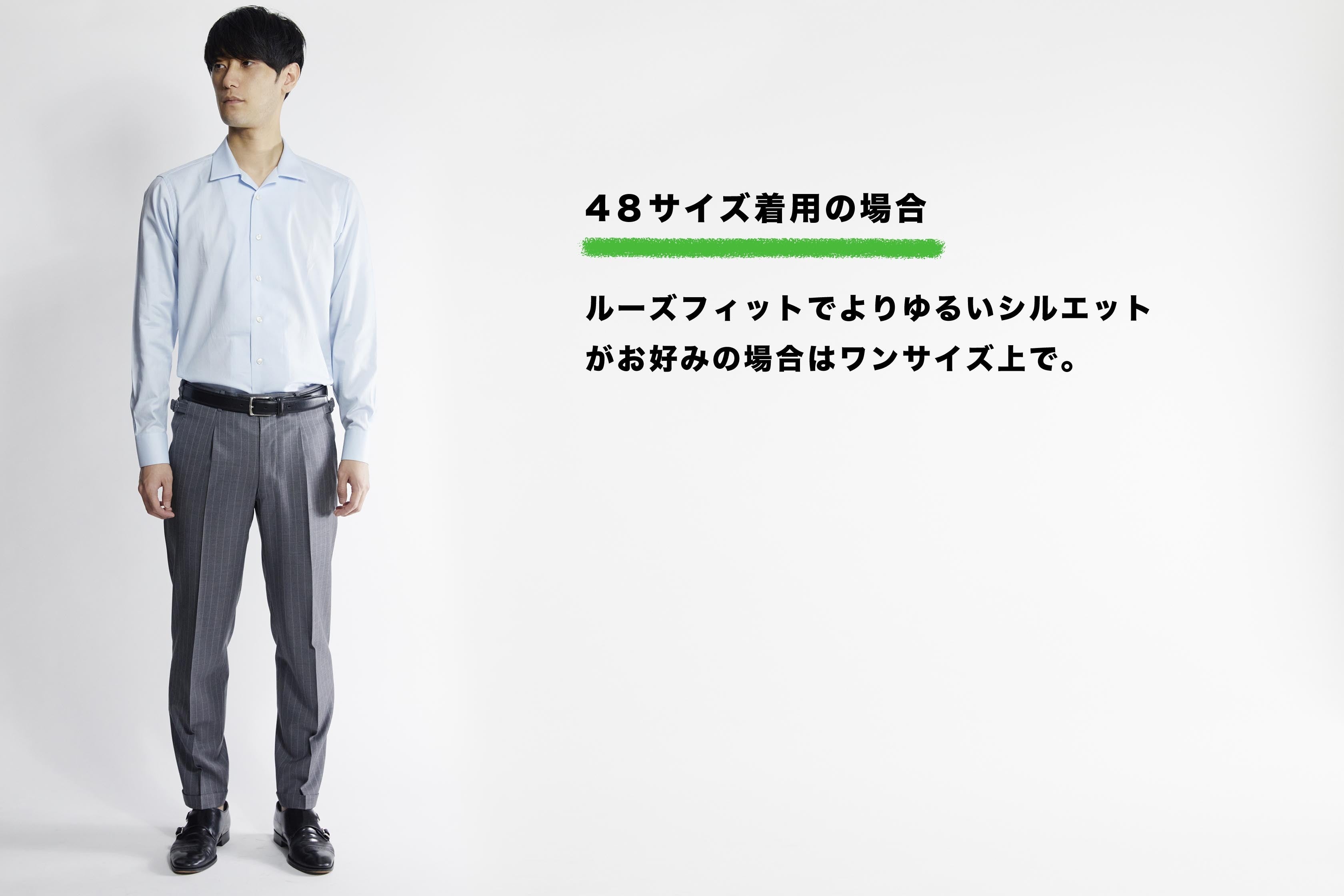 48サイズの着用感は胸周り、腕回りに適度なゆとりのある感じです。着心地も楽でリラックスして着られます。余裕はあるものの、上からジャケットを羽織っても中で袖がもたつかない程度なので、ゆるく着こなしたい方はこのくらいのサイズ感がおすすめです。