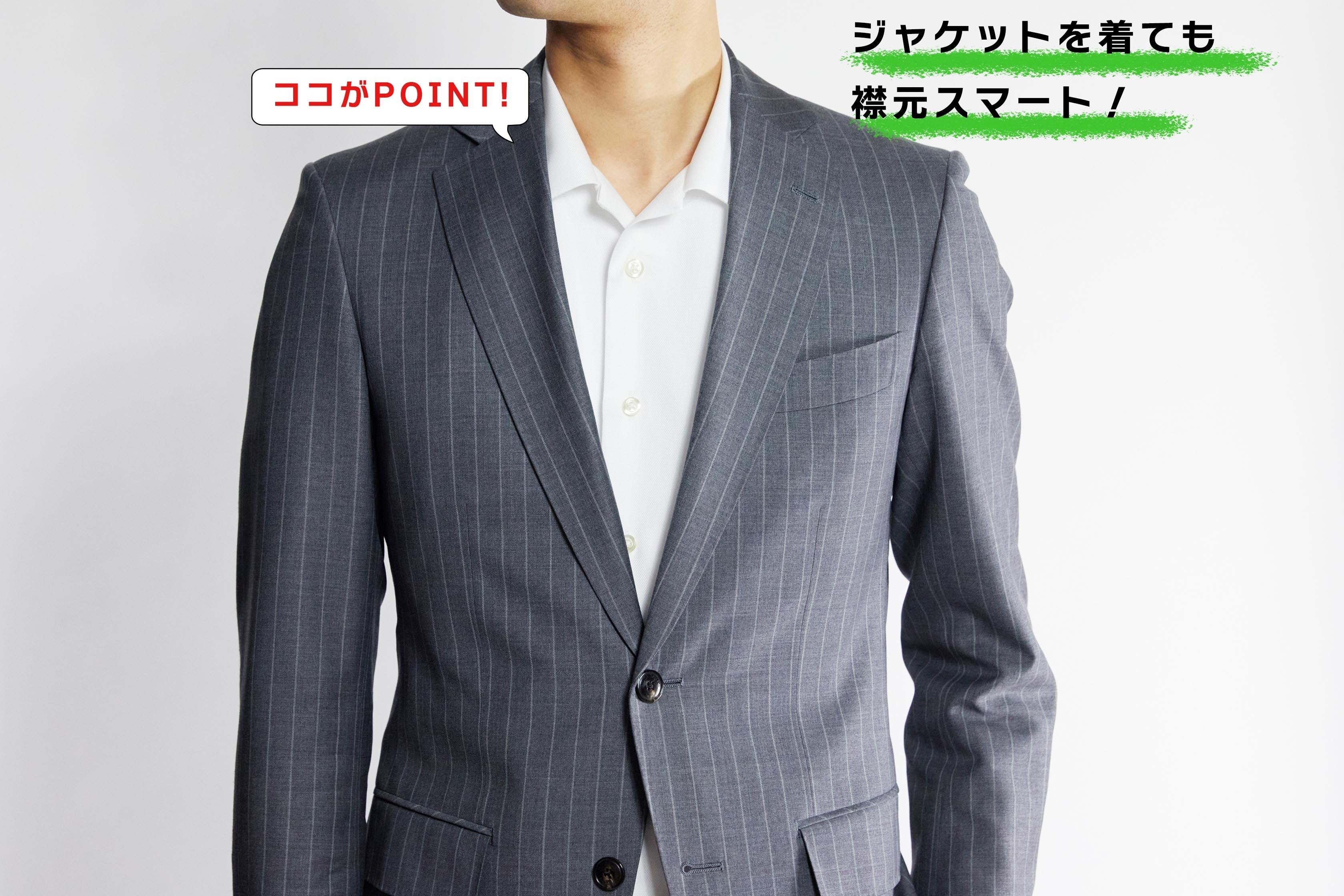 ジャケットを着ても、スッキリとしたスマートな襟元になるよう徹底的に襟のシルエットにもこだわりました。