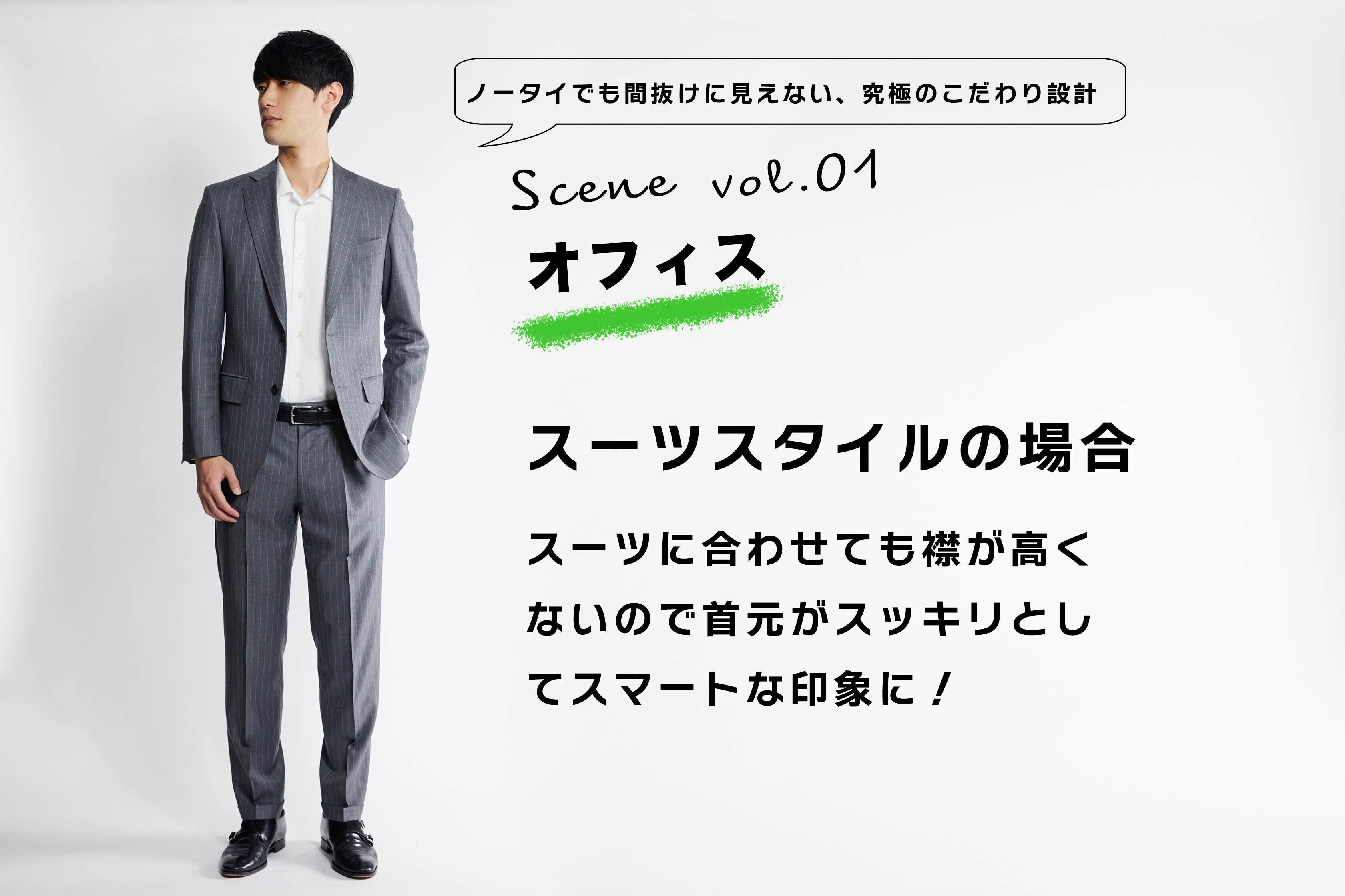 ビジネスで着用できるように徹底的に襟の形とシルエットにこだわり開発した開襟。