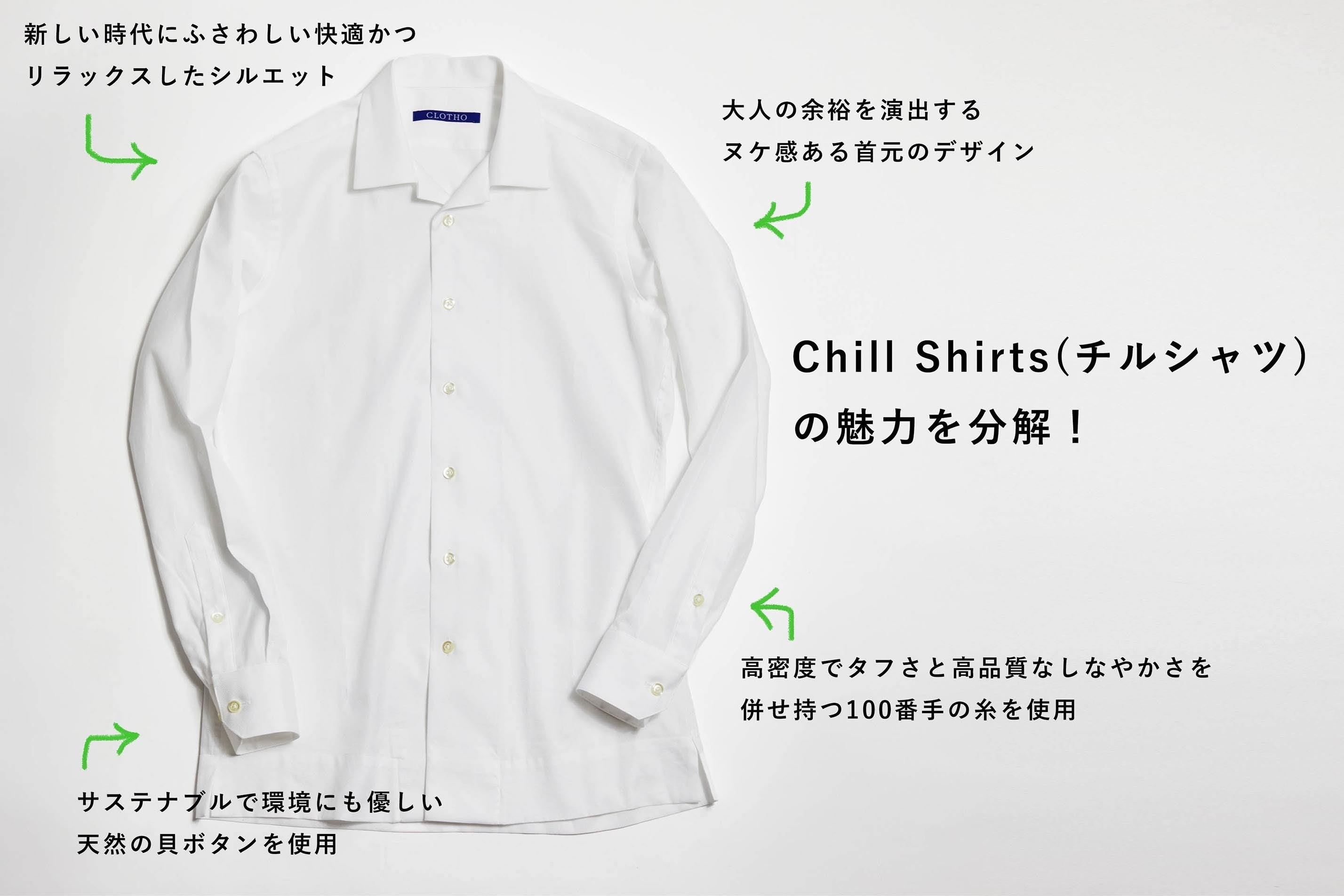 COVID-19をきっかけにビジネスシーンはテレワーク・リモート会議・オフィス通勤など多様性が広がり、ビジネスウェアにも快適さと機能性が重視されるようになりました。オーダースーツ事業を営んでいるGinzaTailorCLOTHO(クロト)ではビジネスウェアを知り尽くしたテーラーだからこそ出来る、新しい時代にマッチしたビジネスシャツを開発しました。シャツ1枚でもサマになり、ジャケットを着ても襟元がスッキリと美しい、ネクタイいらずのシーンに最適な「Chill Shirts(チルシャツ)」が誕生しました。新しい時代にも大人のカッコいいビジネスライフのパートナーになる渾身の新ビジネスシャツが「チルシャツ」です。