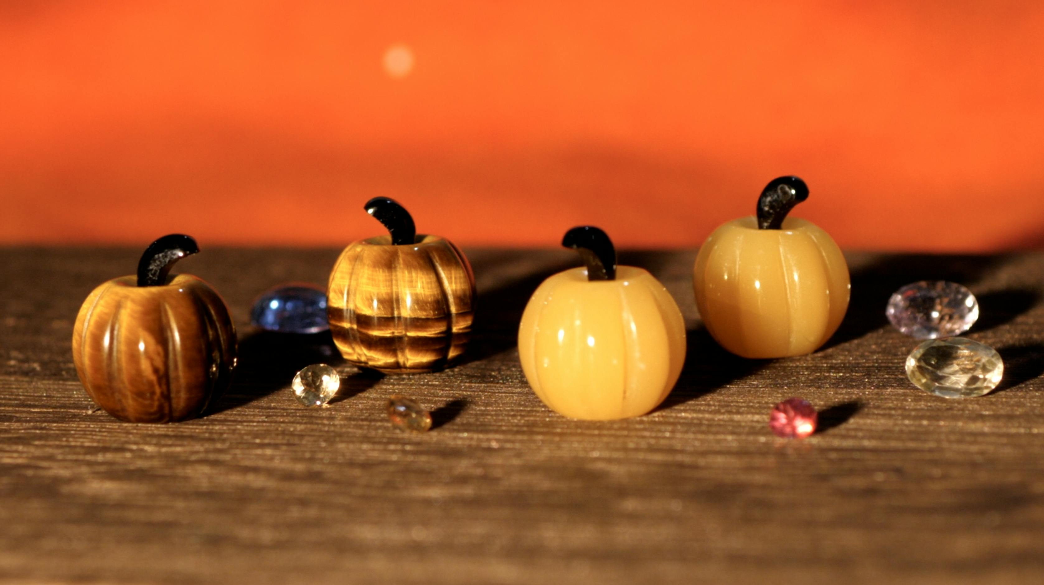 こちらのカボチャの宝石は「タイガーアイ」の上に「オニキス」を接着して