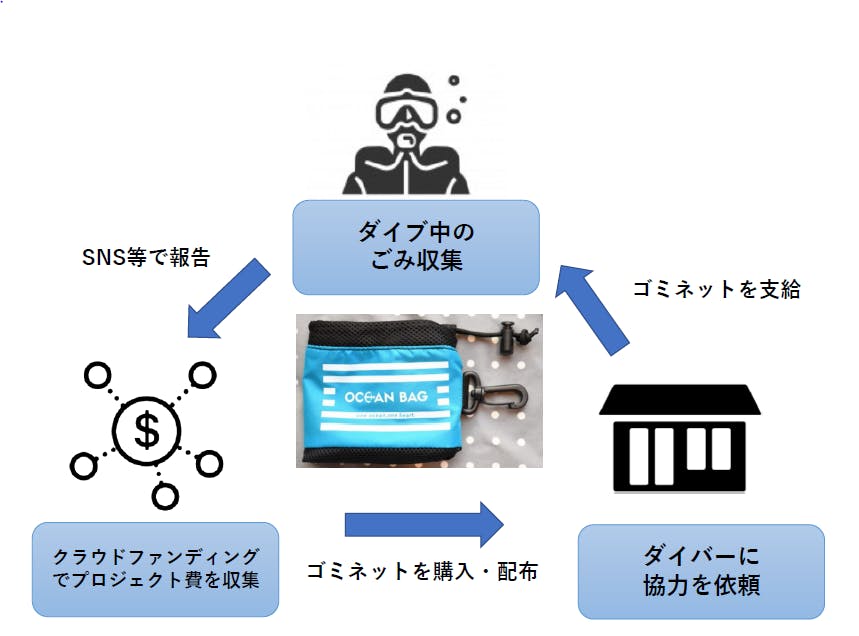 ダイバーの海のために何かしたいという気持ちとダイバーにできること、そしてダイバーでない人の海に対する気持ちをつなげ、社会全体で海のゴミ問題に取組める仕組みづくりができないかと考えました。