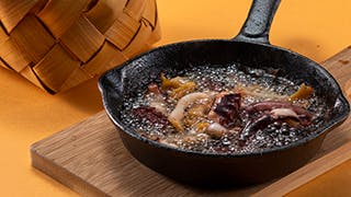 能登の里山里海アヒージョセット: 原木しいたけ「のと115」と砂肝、たけのこなどを米油でアヒージョにした「里山アヒージョ」、甘みの強いアオリイカ・旨味が広がる真だこ・鮮度にこだわった白バイ貝などの「里海アヒージョ」のセットです。スキレット付(賞味期限:冷凍90日)。