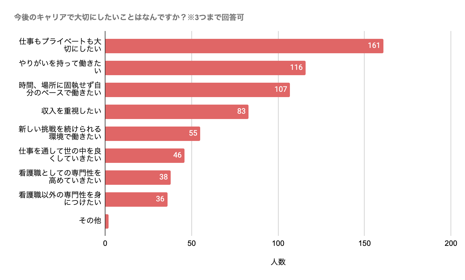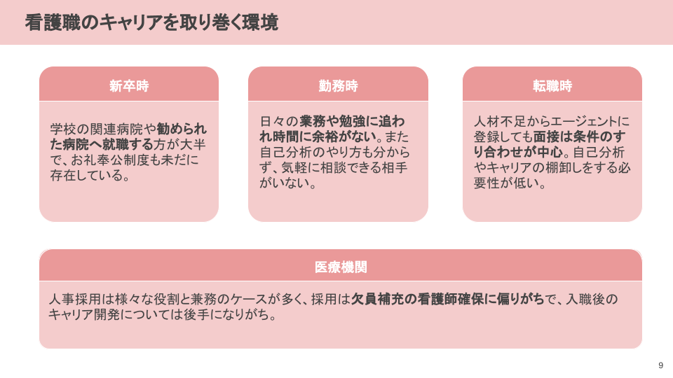 アンケート回答とは少しそれますが、この背景には看護職のキャリアを取り巻く環境の影響があると思っています。