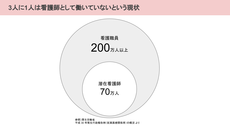しかし、200万人以上いる看護職のうち資格を持ちながら看護職として働いていない潜在看護師が70万人以上います。