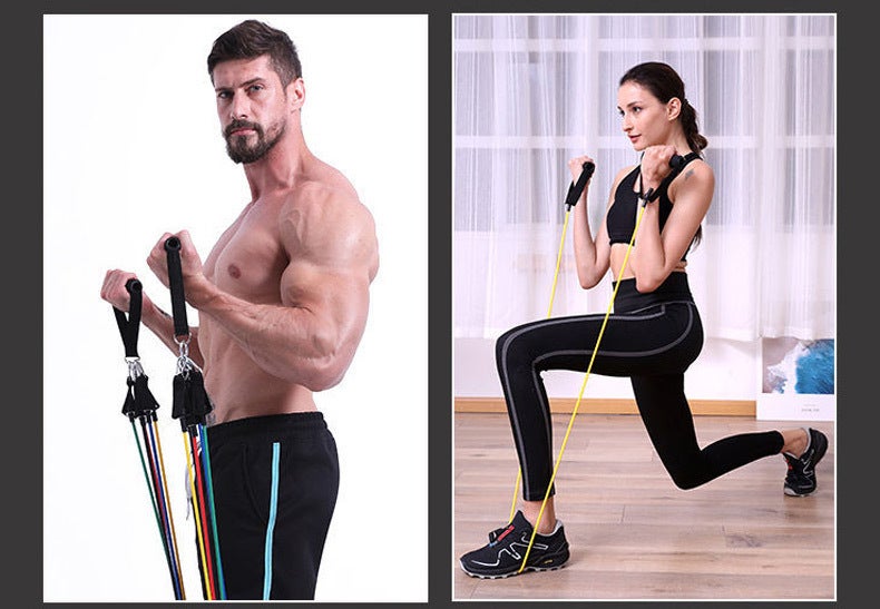 レジスタンスチューブセットは持ち運びができて、いつでもどこでも筋力トレーニングをすることができます。
