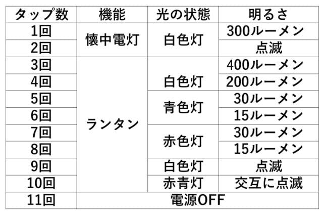 ランタンは白色灯のみと赤青の2種類の点滅モードがあるので、