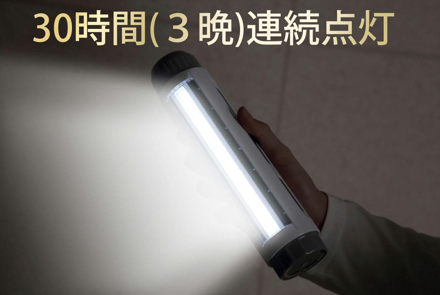 ランタンなら連続30時間、懐中電灯なら48時間連続点灯可能なので、1回の