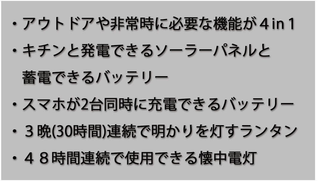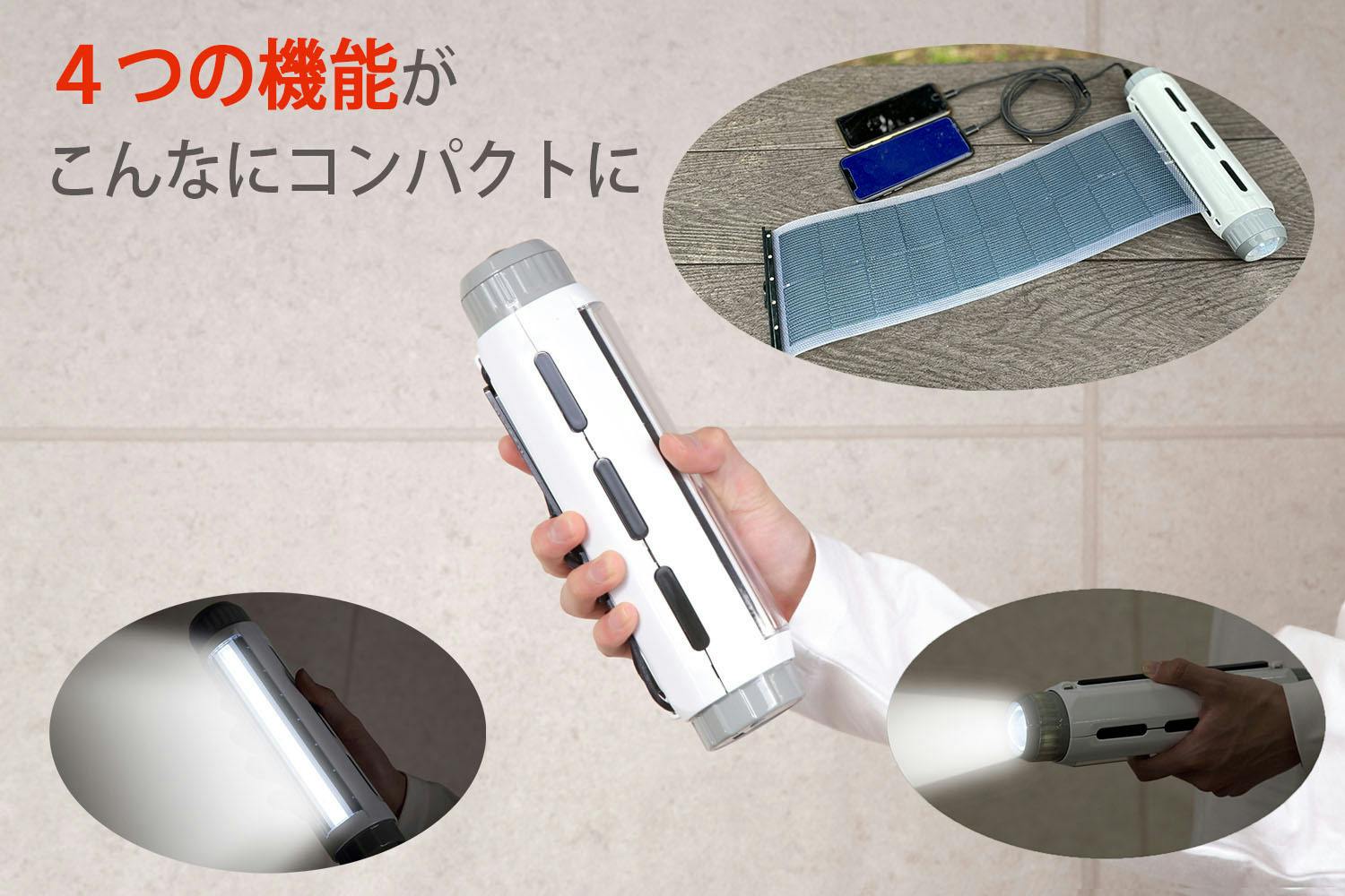 害時に必要な「ライト」、「太陽光発電装置」、「携帯バッテリー」の機能を