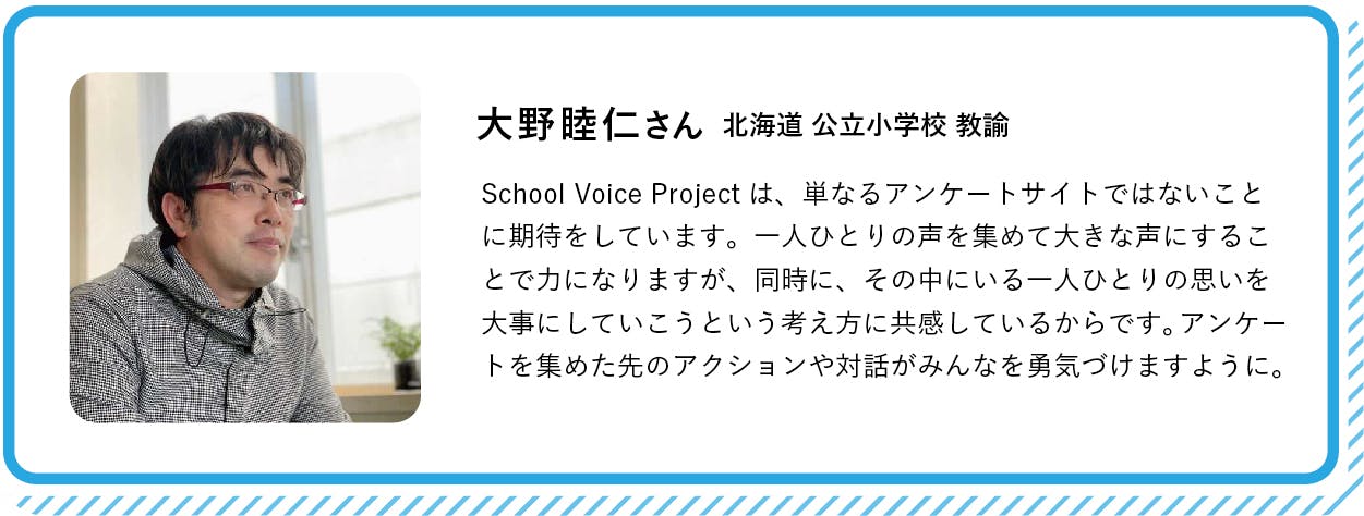School Voice Projectは、声が届き、実際に物事が動いていくという経験を、たとえ小さなことからでも、現場の教職員の方とともに積み重ねていくことで、教職員の方が「変えていける実感」「声が届いている感覚」を持てるようにすること。まずは、そこを目指していきます。