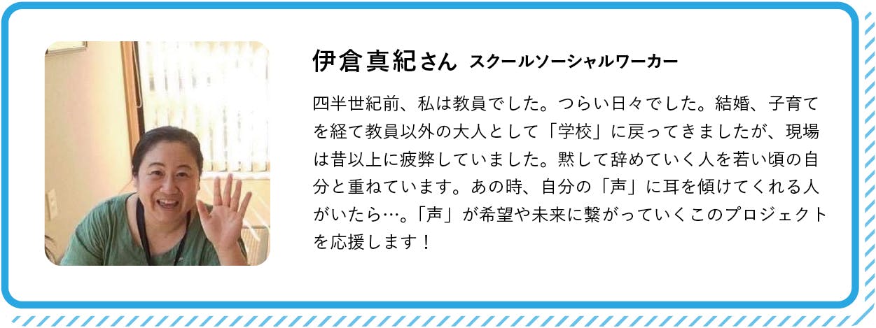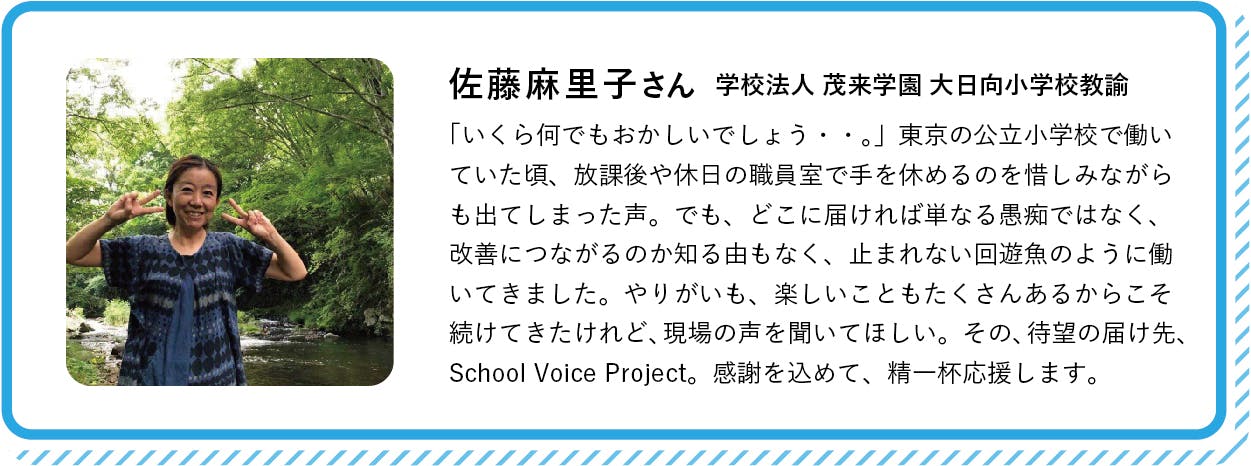 今まで抵抗があって署名なんてしてこなかったという先生から、「今回だけは、いてもたってもいられなくて署名した」「署名をきっかけに同僚と話せた」「意見を言える場ができて救われた」という言葉をもらいました。このネット署名を実施したときの手応えが、今回の「School Voice Project」につながっています。