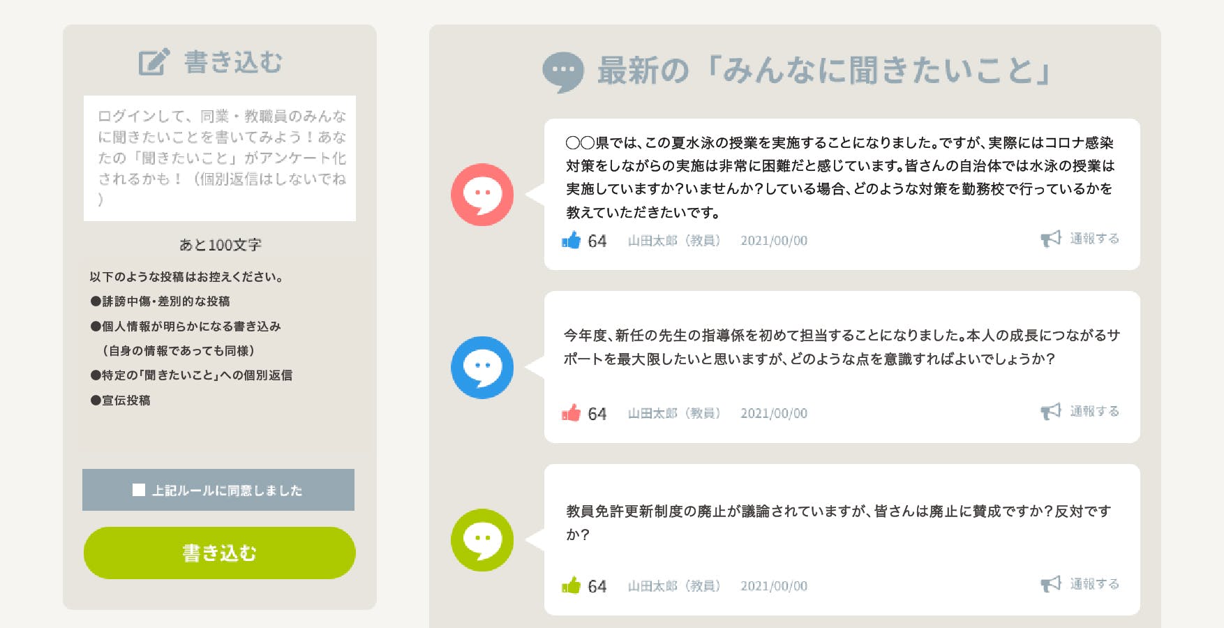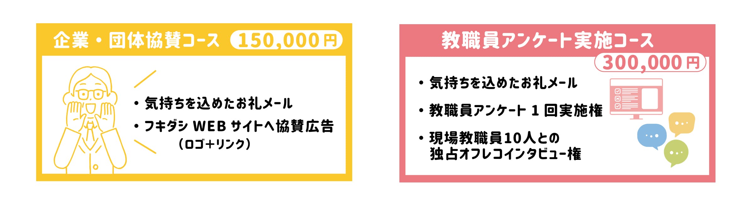 2021/08/26 13:37こんにちは!School Voice Projectを応援してくださっている皆さん、ありがとうございます。この間、クラウドファンディングと先行ユーザー登録キャンペーンを実施する中で、複数の方から寄せられたご質問がいくつかありました。そこで、この活動報告欄にて、順次ご説明したいと思います。以下の3つのご質問について、3回に分けてお伝えします。1)「"フキダシ"には誰が登録できるの?」2)「個人情報やアンケート結果の扱われ方はどうなるの?」3)「今後の運営資金はどうしていくの?」1つ目は昨日投稿済みになります。(気になる方はお読みください^^)今回は2つ目、「個人情報やアンケート結果の扱われ方はどうなるの?」についてです。ーーーーーーーーーーーーーーーーーーーーーーーーーーーーーーーこの間、教職員の方を中心に、ユーザー登録するにあたって、気になること・不安なこととして、「登録した個人情報は誰が見られるの? 教育委員会などに声を届けるときに、個人が特定されることはありませんか?」 「現場の声といっても多様で、いろいろな意見があると思いますが、 運営側の意図によって、恣意的に"現場の声"が利用されてしまわないか」といった声が届いています。いずれも、不安に感じられるのも、もっともだと感じました。そこで、現時点で考えている仕組みや、School Voice Project としての考え方・方針を、以下の通り、お示ししたいと思います。●ユーザー登録時に入力していただく個人情報の扱い等についてユーザー登録時に入力していただく情報については、「"フキダシ"には誰が登録できるの?」の投稿でも詳しく紹介しましたが、以下のようなことをお書きいただいています。勤務校の校種、設置者、学校規模、雇用形態、職種、教科(教諭のみ)、校内での役職・立場、生まれた年、勤務年数、担当部活、性別、勤務自治体、ニックネーム 等これらの情報のうち、ニックネームと職種については、サイト内の「みんなに聞きたいこと」のコーナーに書き込んだ際には表示される仕様になっています。その他の情報を見ることができるのは、運営者(School Voice Project事務局)のみで、オープンになることはありません。プライバシーポリシーの詳細については、以下からご確認いただけます。→ School Voice Project /フキダシの個人情報保護方針●アンケート結果をメディアや行政等に届ける際の個人情報の扱いについてこちらについても、複数のご質問をいただきました。例えば教育委員会にあるテーマについてのアンケート結果を届ける際に、「○○小学校の□□先生がこんな意見を言っている」ということが分かってしまって、不利益が起こらないか?というご不安を抱かれる方もいらっしゃると思います。その点については、School Voice Projectでは、「この属性の教職員の方の、何割がこう答えています」というように、あくまでも個人が特定されないかたちで、メディアや行政にアンケート結果を届けてまいりますので、ご安心ください。また、WEBアンケートサイト「フキダシ」では、ユーザー登録の際、実名と勤務校については「必須」ではなく「任意」で、抵抗がない方のみお書きいただく仕組みになっています。アンケート結果の信頼性をより高めるという意味では、実名と勤務校付きで登録されている方が、(個人が特定されないかたちをとるにせよ)、メディアや行政にとってのインパクトは大きくなるのは確かです。ただ、現段階では、不安に感じられてユーザー登録を断念する方が多くなる可能性を考え、「任意」とさせていただいています。この点については、本プロジェクトを応援してくださる方々の中でも、ご意見が分かれるところかと思いますが、内部でも時間をかけて議論し、現段階ではこのような判断になっております。ご理解いただければ幸いです。●運営側の意図によって恣意的に「声」が使われないかというご心配についてこの点については、ご指摘いただいて、不安を抱かれるのももっともであると感じました。特に、呼び掛け人の武田や、運営サイドのメンバーとつながりのない方にとっては、「そこの信頼が担保できなければ参画できない」と思われても仕方ない部分だと思います。この点について、私たちが考えていることは以下の通りです。まず、集まった声を、「School Voice Project」「フキダシ」としては、あくまで中立性・客観性を担保したかたちで発信します。武田個人や、それぞれのメンバーは、もちろんテーマごとに「自分の意見・主張」は持っていますが、それを主張するために、「フキダシ」に集まった声を利用することはしないことをお約束します。WEB記事や、行政に対しての情報開示、メディア向けに会見をする際などの、発信のイメージとしては、以下のようなものになります。「この件について、フキダシに登録している現場の教職員の方たちのうち、何%は賛成、何%は反対、何%はどちらとも言えないと答えています。賛成については