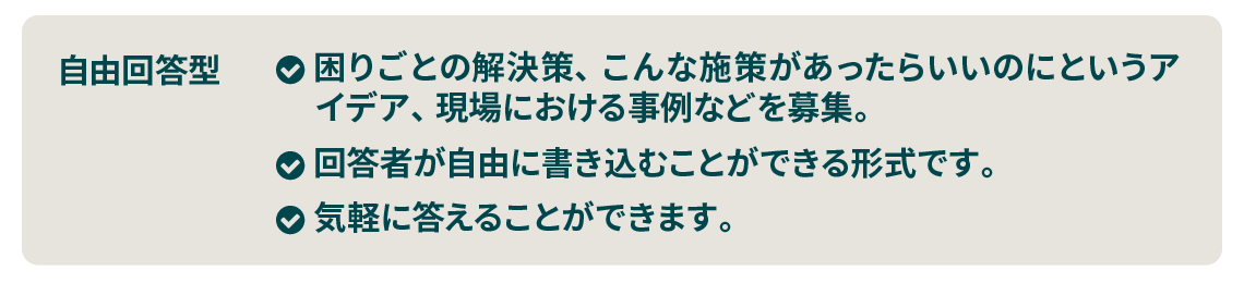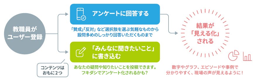 ネット上で気軽にアンケートに答えられる仕組みをつくり、現場の教職員の方から、さまざまなトピックついての意見や思いを集めます。そしてそれを、現場で活かせるようにまとめて発信したり、世の中や行政に届けるアクションを起こします。