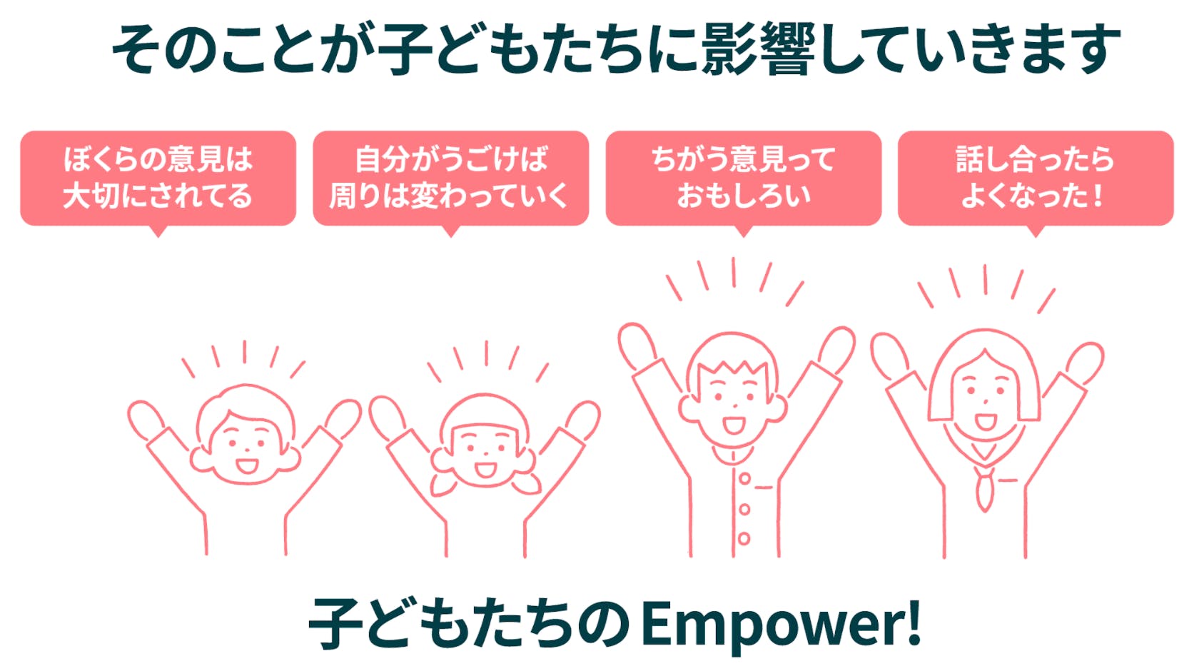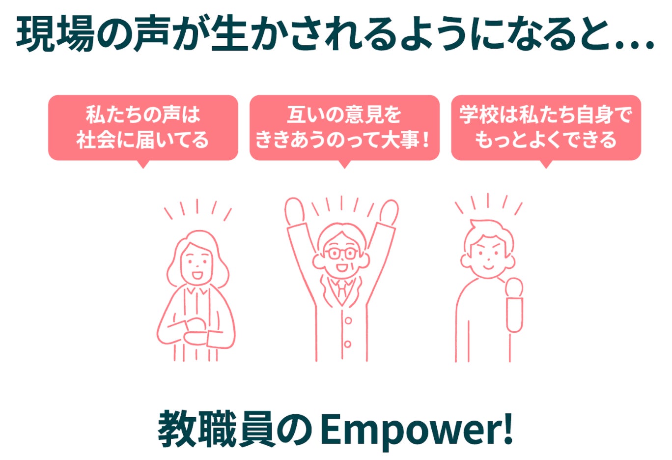 学校教育を取り巻く状況がよくなっていくことで、教職員の方がゆとりを持って子どもたちに関われるようになること。幸せに、やりがいを持って、主体的に働く大人の姿を、子どもたちが日々見て育っていくということ。それが、子どもたちに与える影響は、きっととても前向きなものであるはずです。