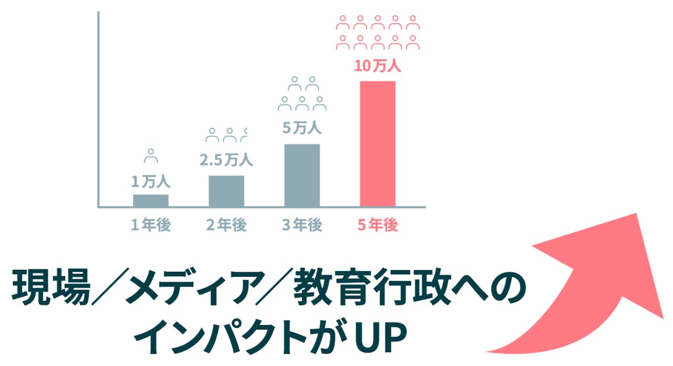 5年後までに教職員10万人の登録を目指す大規模プロジェクトです。たくさんの現場の声を集め、学校や社会に影響を与えられるプラットフォームに育てていきたいと思い、すでに学校をよくしたいと願う100人の仲間とともに動き始めています。そのほとんどは現職の教職員の方です。