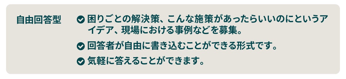 ・SNSと違い、一定の個人情報を入力の上、ユーザー登録をしていただくことで、集まっている声の信頼性を担保します。(ニックネームと職種以外の情報は公開はされず、事務局のみが把握できる仕組みです。アンケートの分析や、アンケート対象の絞り込みのために活用します。)
