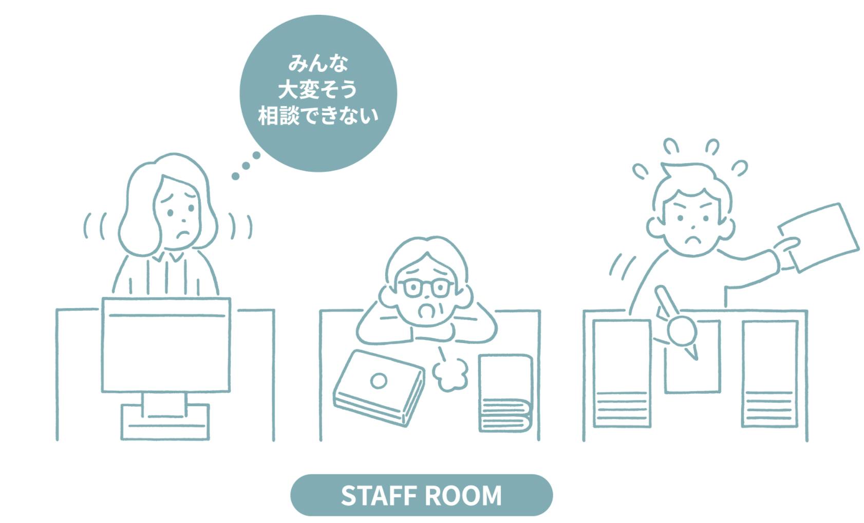 学校には先生以外にも、事務職員、用務員、給食調理員、スクールカウンセラーやスクールソーシャルワーカー、ICT支援員など、子どもの成長を支える大人たちが勤務しています。「子どもたちのために自分ができることをしたい」「学校が抱える課題をどうにか解決したい」、そう願っている人が大多数です。ですが残念ながら今の学校は、そんな大人たちが体や心の余裕を持って働ける場所になっていません。
