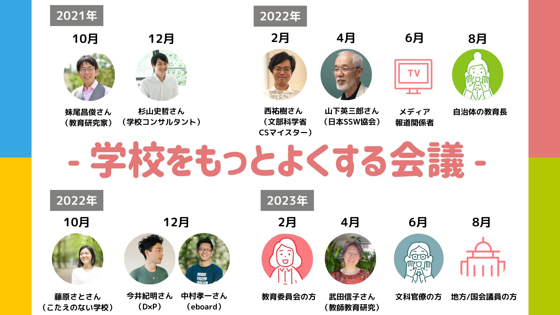 学校教育や教育行政に詳しいさまざまゲストが参加していただく参加型・オフレコのオンライン対話イベントにご参加いただけます。このようなゲストラインナップを予定!