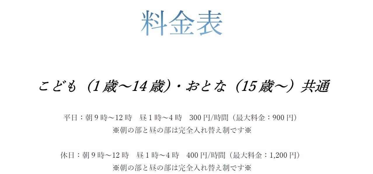 (現在、平日は1時間300円で運用予定。土日祝日は1時間400円で検討中)なお、子供の成長を保護者が「理解する」場所にしたいと考えていますので、子供を預かる託児所ではなく、保護者が子供を見守る場所にしたいと考えています。