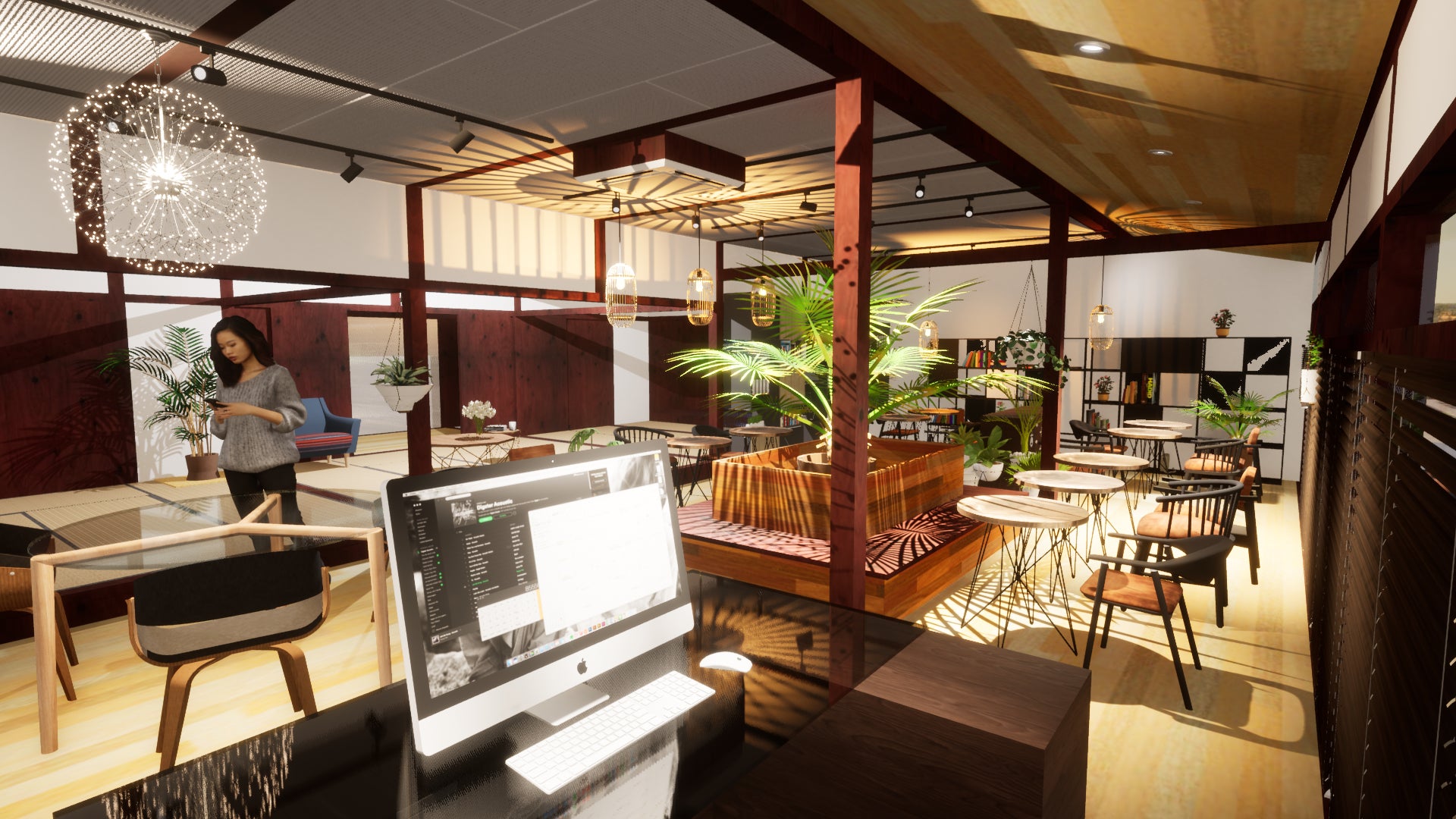 ↑都会的な空間に和室が!?都市部のカフェと古民家の融合です。(CG画像)