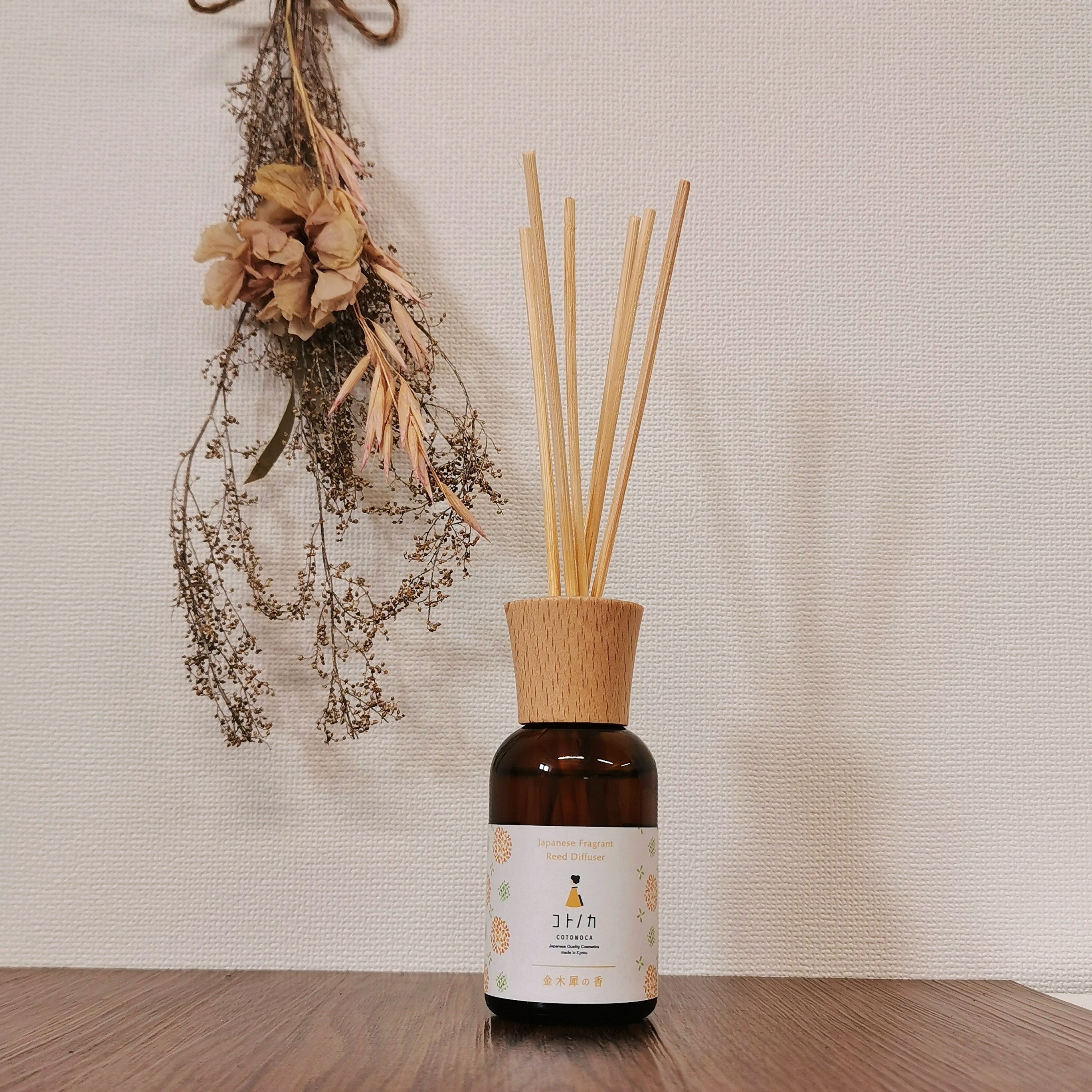 上質なアロマとインテリア性を併せ持つリードディフューザー。香りが広がりやすいラタンスティックを採用し、スティックの本数で香りの調節もでき、お部屋に金木犀の香りを添えてくれます。