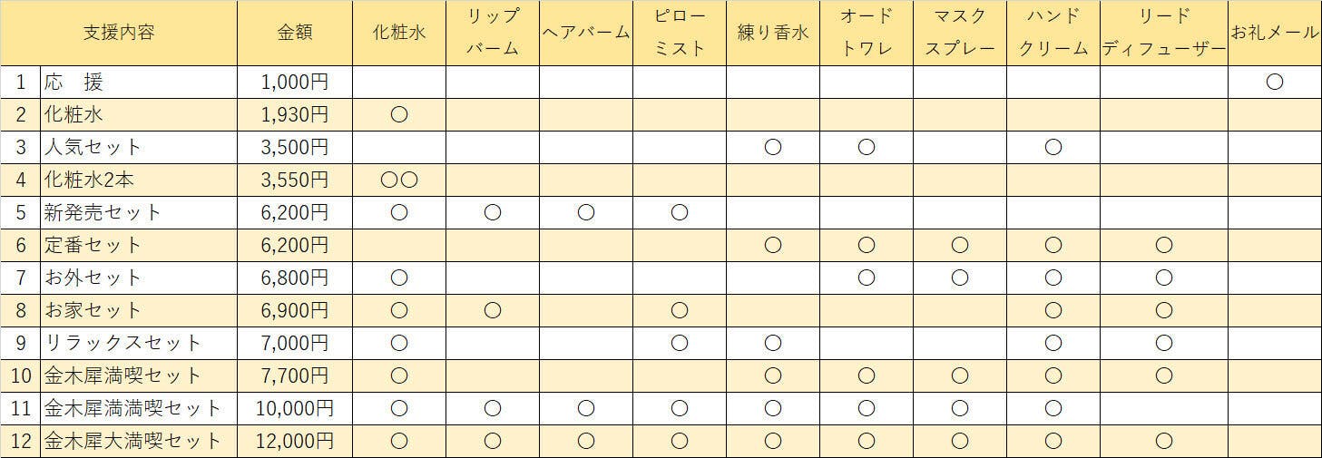 今回のクラウドファンディングのリターンとして、コトノカ自慢のまるで本物の金木犀かのような香りを追求した金木犀シリーズをお届け致します。通販や実際に店頭でお買い上げくださるよりお得にご用意させて頂きました。もちろん、送料はこちらで負担させて頂きます!