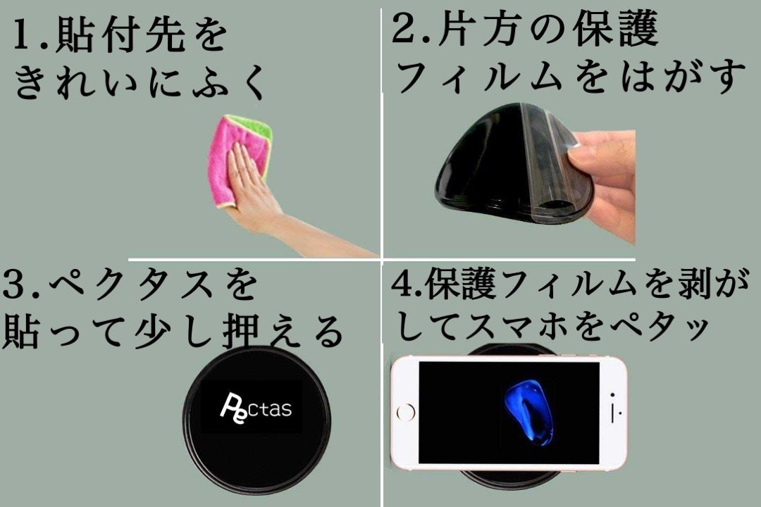 両手を離して自撮りや動画撮影するとき、スマホスタンドなら、三脚を伸ばして足を広げて、やっとスマホを装着。一方のペクタスなら、携帯袋から取り出して離型フィルムを剥がせばスグに使えます。