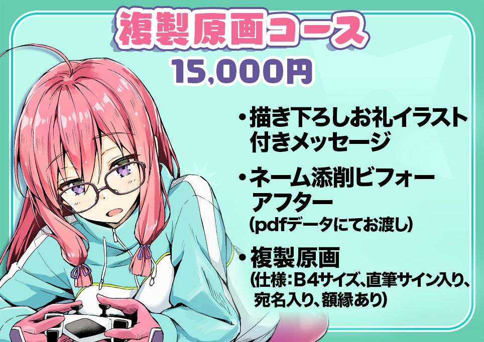 新たにリターン品を追加しましたのでご紹介いたします。15,000円の複製原画に和泉緋那(いずみひな)のバージョンを追加しました。