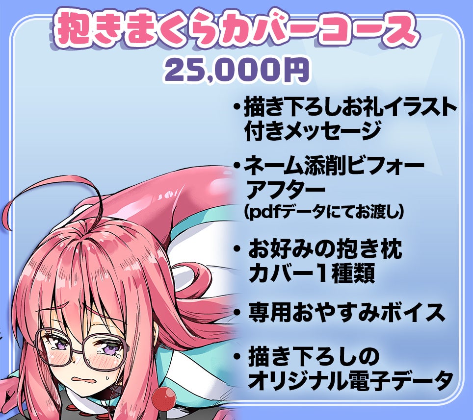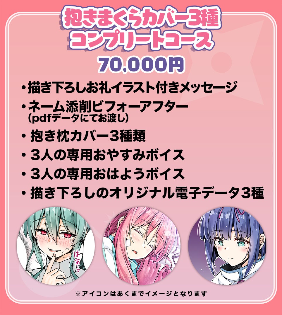 ※70,000円の抱き枕カバーコンプリートセットは単体で3種類揃えるよりもお安くさせていただいております。3種類揃えたいご支援者様は、25,000円のコースではなく、70,000円のコースをお選び下さい。