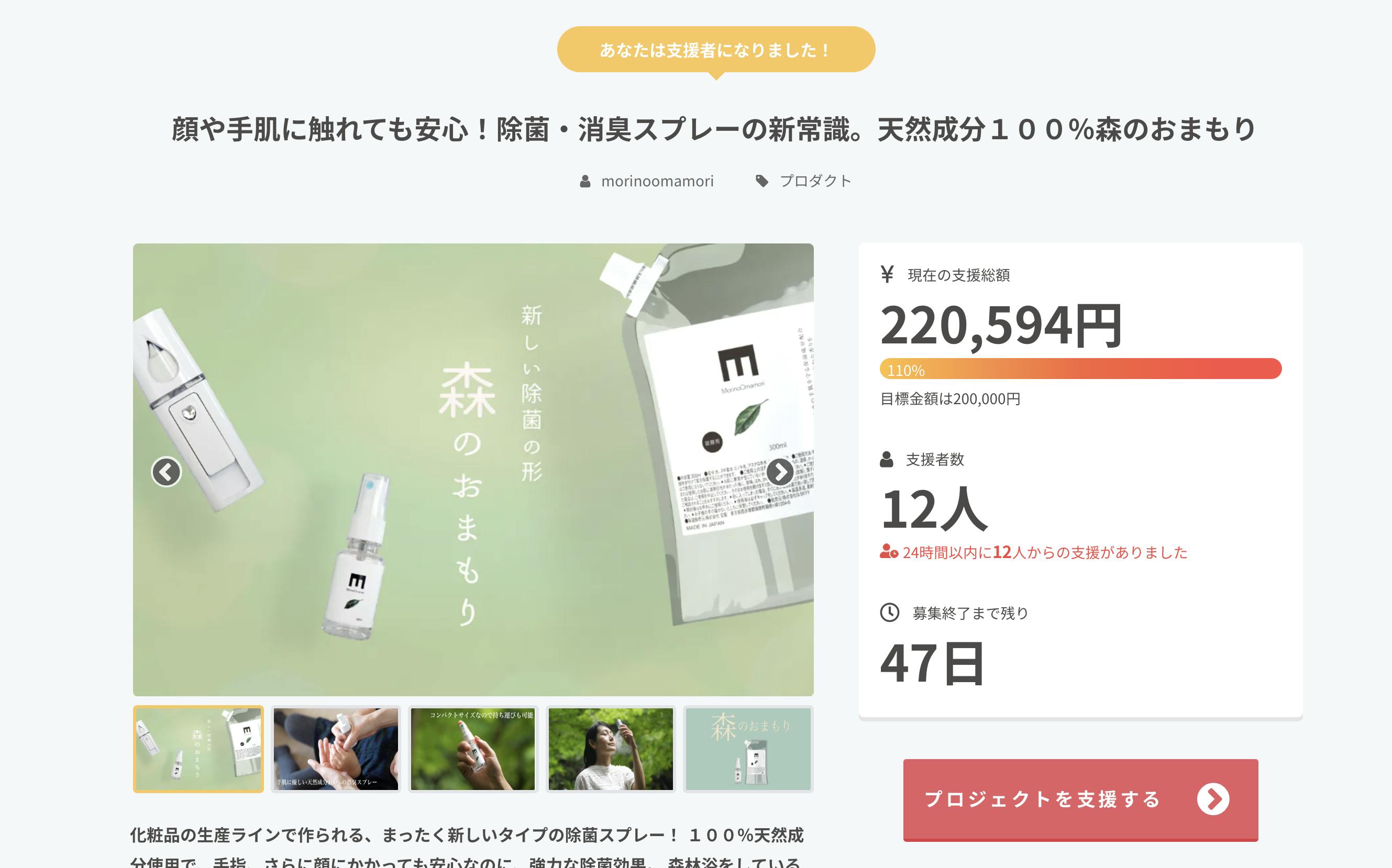 2021/11/01 15:3629日に販売を開始した「森のおまもり」がお陰様で、目標額の20万円を達成することができました。しかも開始1時間30分で達成ということで、皆様のご支援のおかげです。本当にありがとうございます。まだ始まったばかりですので、今後もご支援をいただき、目標額の倍、50万円、100万円とご支援いただけるよう全力を尽くしていきます。今後ともご支援、応援のほどよろしくお願いいたします。ここで、少し商品についてお伝えさせていただきます。「森のおまもり」の商品ラインナップの中でも超早割は、赤字覚悟の割引をさせていただいておりますので、販売している間にお買い上げいただけると幸いです。①【超早割30%OFF】森のおまもりスプレータイプ30ml×1本+詰め替え300ml×1本4,242円 残り9人まで②【超早割】スプレー30ml×5本+携帯噴霧器×5本+詰め替え300ml×10個34,020円 残り11人まで③【超早割】スプレー30ml×1本+携帯噴霧器×1本+詰め替え300ml×2本8,302円 残り19人まで特にこの3種類は大変お得になっておりますので、売り切れになる前にお早めにお買い求めいただけると嬉しいです。改めて、開始1時間30分で目標を達成できるとは思ってもみませんでした。本当にご支援ありがとうございます。そして、プロジェクトが終了するまで、そして皆様のお手元に商品が届くまでは全力を尽くして、進めていきます。引き続きよろしくお願いいたします。 もっと見る