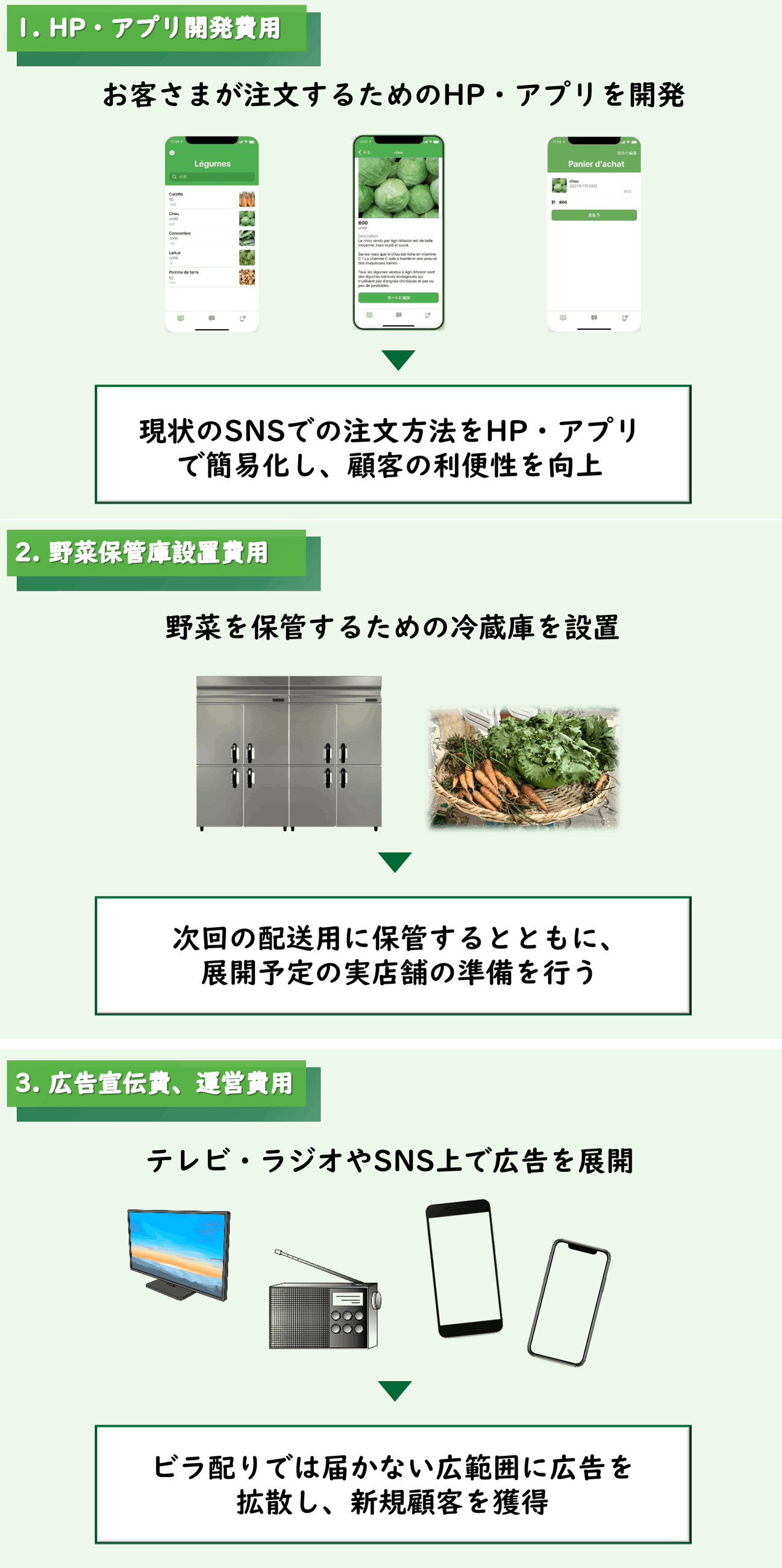 今回は赤枠の『お客さま用HP・アプリの開発』、『各メディア・SNSでの広告』、『野菜保管用の冷蔵庫設置』について、皆さまからご支援いただき実現したいと考えています。
