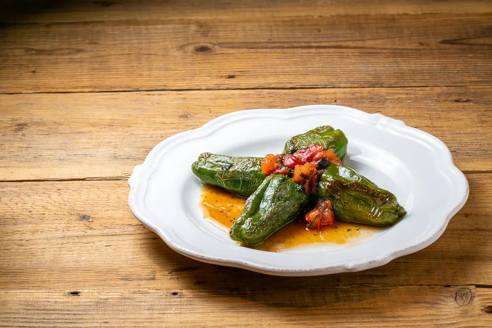ピモン・デスプレット・リキュールを一緒に混ぜ込んだひき肉のたねが入ったピーマンの肉詰めをフライパンでソテーし、さらにピモン・デスプレット・リキュールを加えてフランベし、蒸し焼きにします。そこへフレッシュなトマトソースを添えた、ほのかな辛味とトマトの甘味が絶妙な一品。