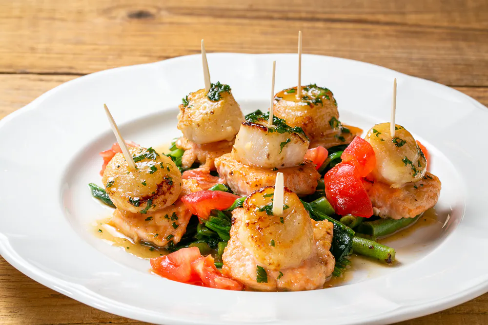 サーモン、ホタテ貝、ほうれん草、いんげんをソテーし、ピモン・デスプレット・リキュール、レモン、バターで作ったソースをかけた、シンプルながらも華やかな一皿。