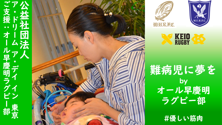 昨年に続き、難病児の夢をかなえるクラウドファンディングに協力いたします。早稲田大学ラグビー部は、昨年のご協力を通して難病児やそのご家族の存在を知ることが出来ました。病児とご家族に楽しい時間を過ごして頂けるよう、今年も微力ながらお手伝い致します。今は誰もが制約の多い生活をしていますが、弊部のグッズを購入し、難病の子供たちに夢の時間を贈ることにぜひご協力ください。そして、コロナが落ち着いた暁にはぜひ試合会場にもお越しください。