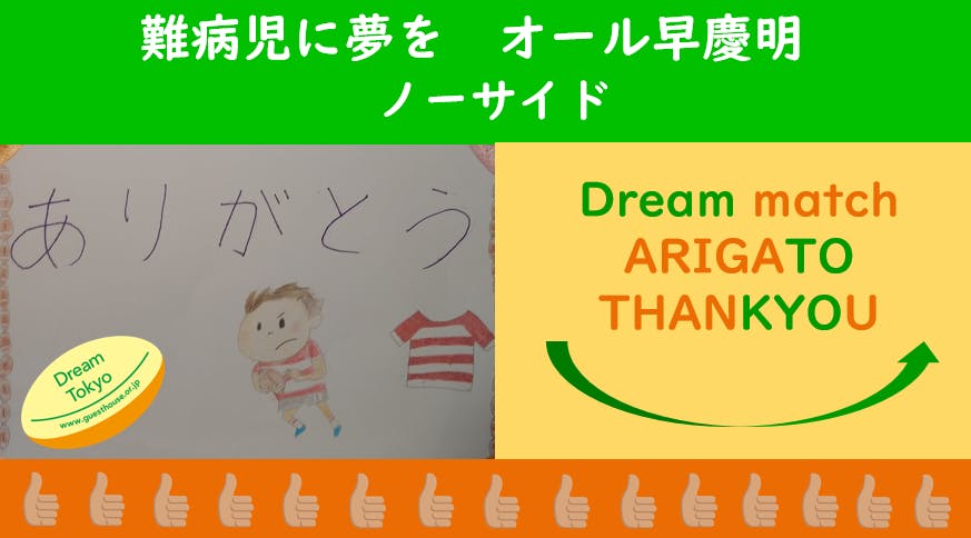 本プロジェクトでは、慶應義塾體育會蹴球部、明治大学体育会ラグビーフットボール部、早稲田大学ラグビー蹴球部の皆様から公益社団法人ア・ドリームア・デイINTOKYO(ドリーム)にチームグッズを寄贈していただき、その収益を病児の支援に使用いたします。